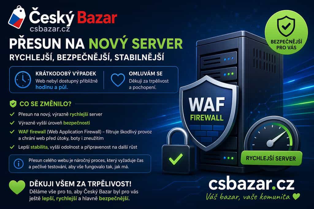 Děkuji všem za trpělivost během výpadku a za pochopení. Vím, že podobné zásahy nejsou nikdy příjemné, ale v tomto případě byly nutné, aby mohl Český Bazar fungovat dál rychleji, bezpečněji a spolehlivěji.
