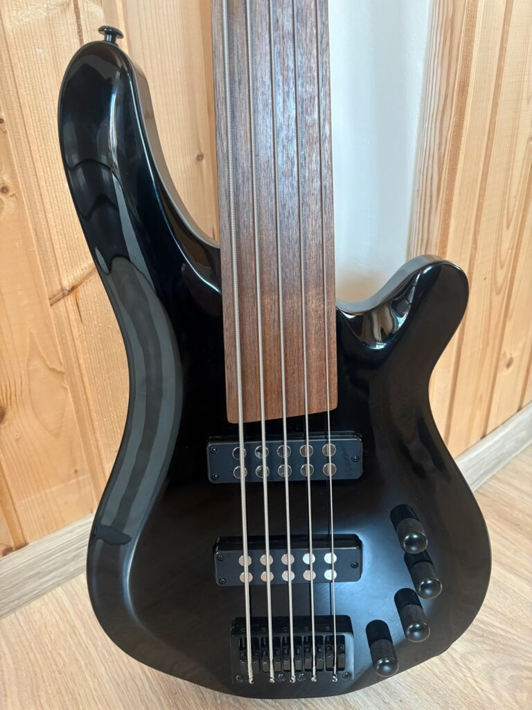 5-strunná Bezpražcová elektrická baskytara Měřítko: 864 mm (dlouhá stupnice) Dvojčinná výztuha krku Ovládání hlasitosti s funkcí push/pull pro aktivní/pasivní Barva: Černá, vysoký lesk Silné nepromokavé pouzdro Vše je nové – nevhodný dárek