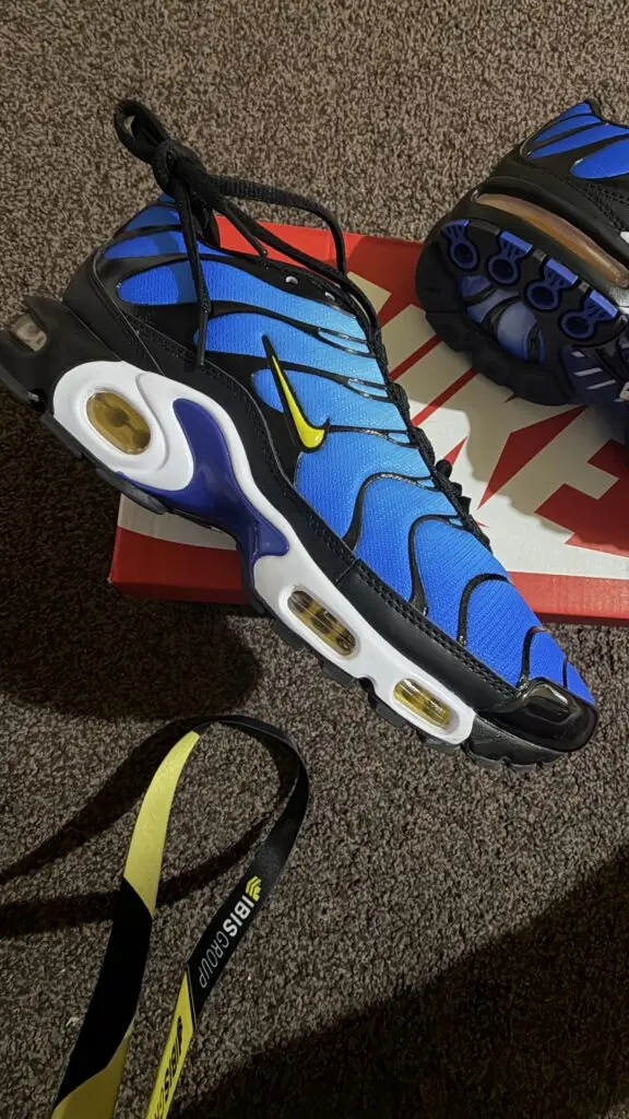 Hyper Blue. Boty mají nezaměnitelný design s modrým gradientem, černou „klíckou“ a výrazným žlutým