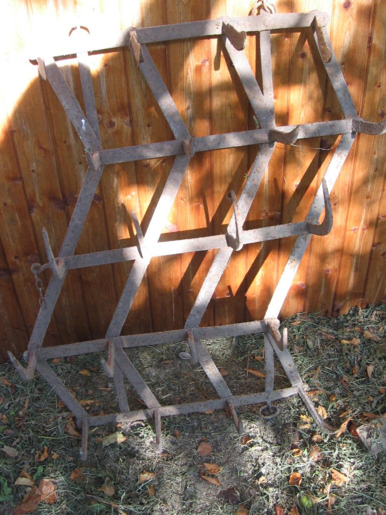 nabízím 1x bránu delší hroty je potřeba ji srovnat je přihnutá 400kč,za malotraktor hrobkovač ,možnost výškového nastavení pluhu u kolečka páčka nefunkční 2700kč,závěs z řetízky délka 125cm, 1000kč,rám na brány 2500kč