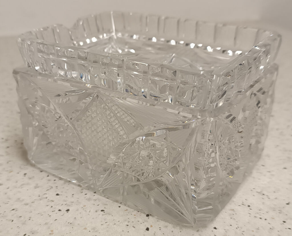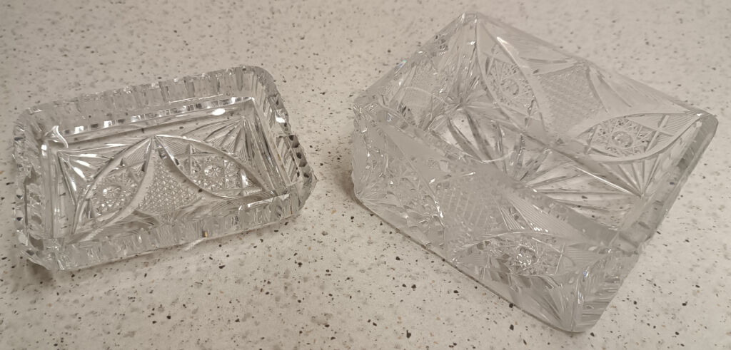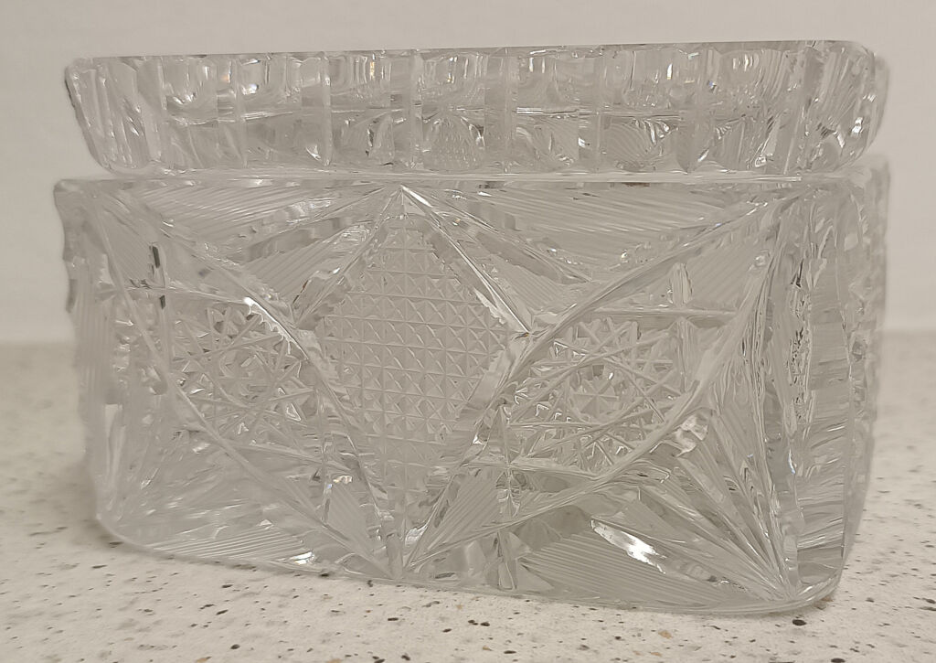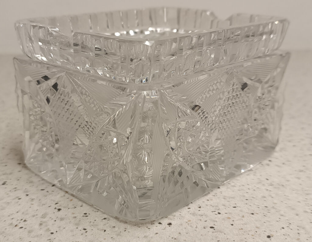 Prodám starožitnou broušenou skleněnou dózu na cigarety a popelník s dekorativními vzory. Šíře 12 cm, hloubka 9 cm, výška 8 cm.