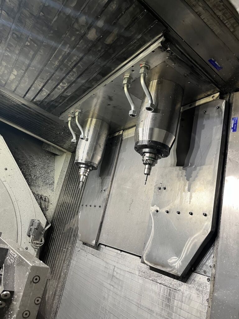 Jedná se o pětiosé dvouvřetenové centrum s pseudopaletizací (otočný buben). osa A (kolíbka) osa C (otočné stoly) jsou indexovatelné.
