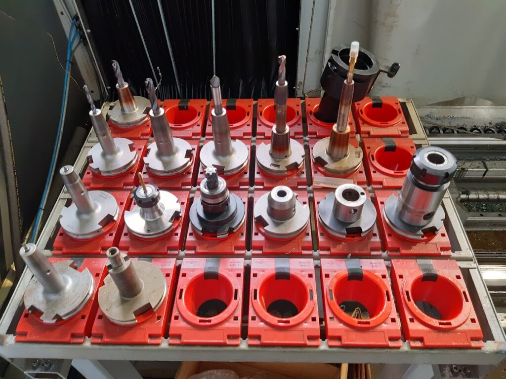 Betonový korpus stroje, vysokotlaké chlazení středem, dopravník třísek, držáky a nástroje.