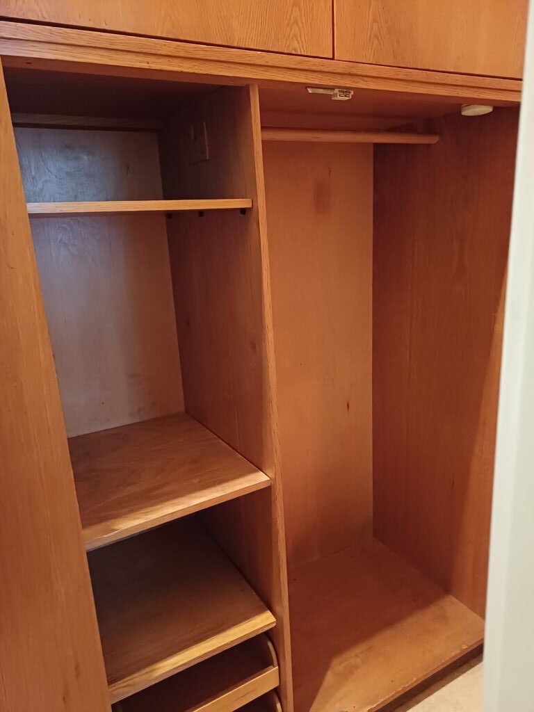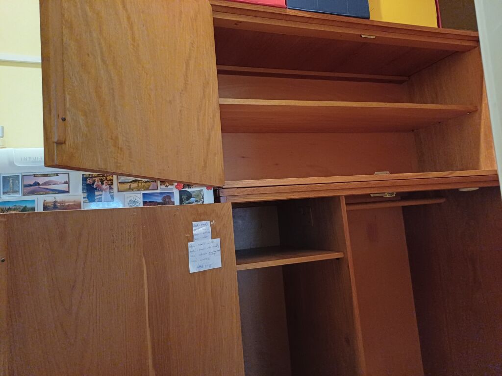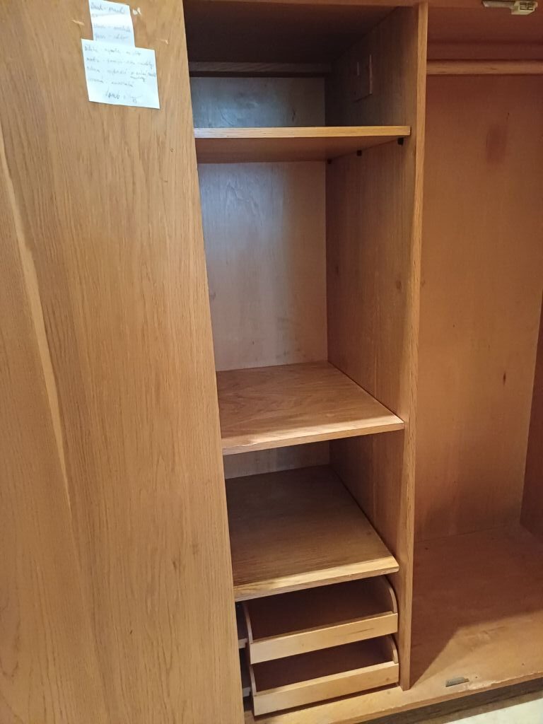 Dřevěná skříň s úložným prostorem rozděleným na dvě části – vpravo tyč na ramínka a vlevo poličky a dva šuplíky (viz fotky). Nástavec je zvlášť s jednou poličkou a dá se zamknout.