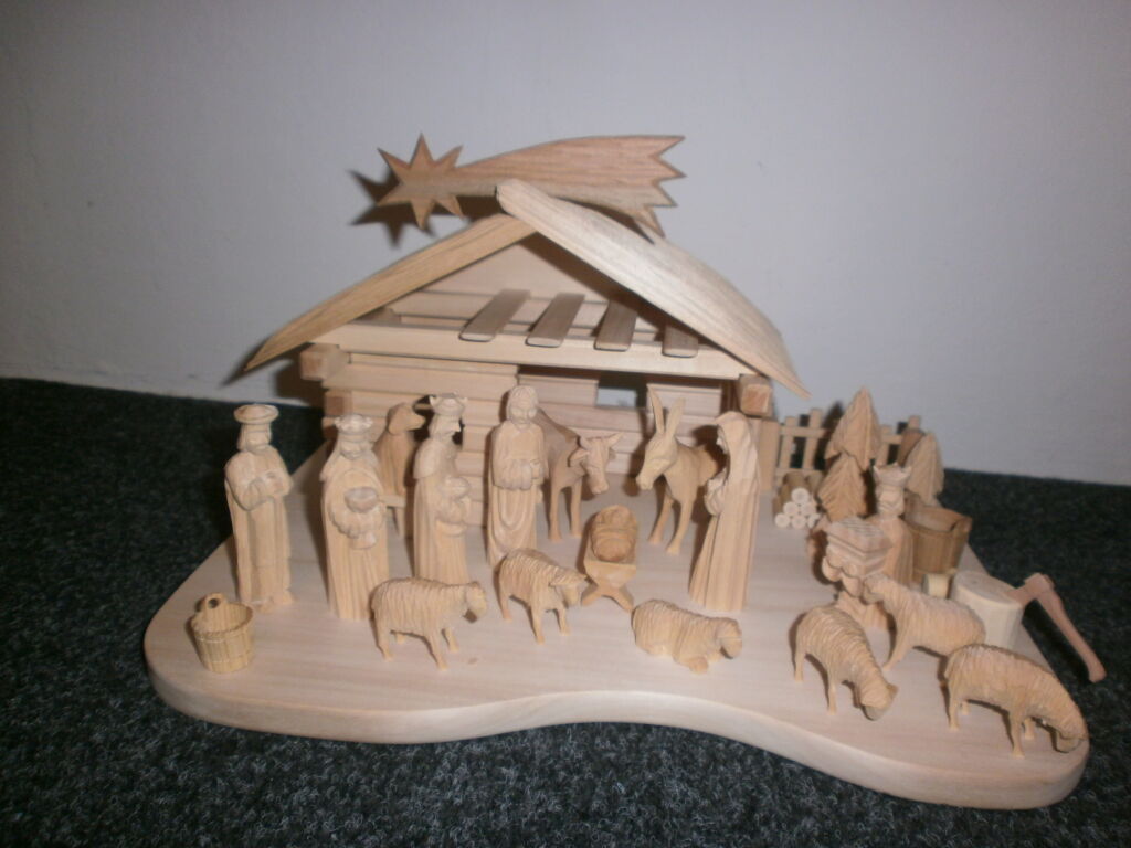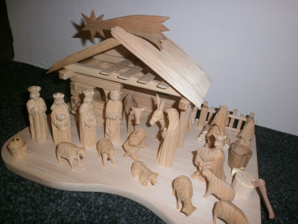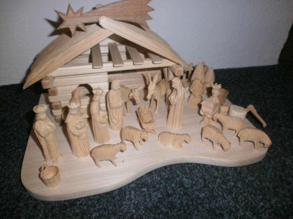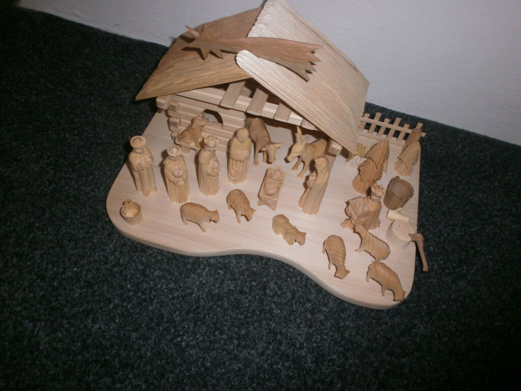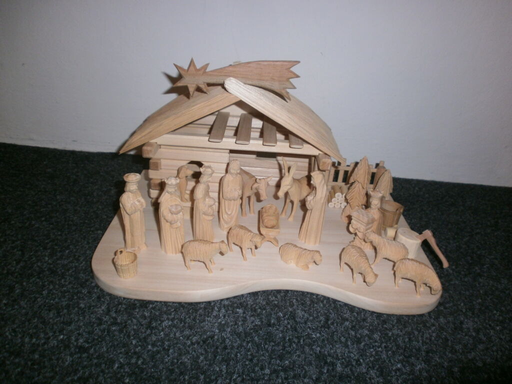 Dřevěný ručně vyřezávaný betlém,velikost domečku šířka=35cm, hloubka=22cm, výška=17cm, figurky jsou vysoké cca 8cm, vyřezané z lipového dřeva, bez povrchové úpravy. Domek je z lipového dřeva.