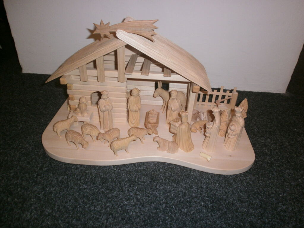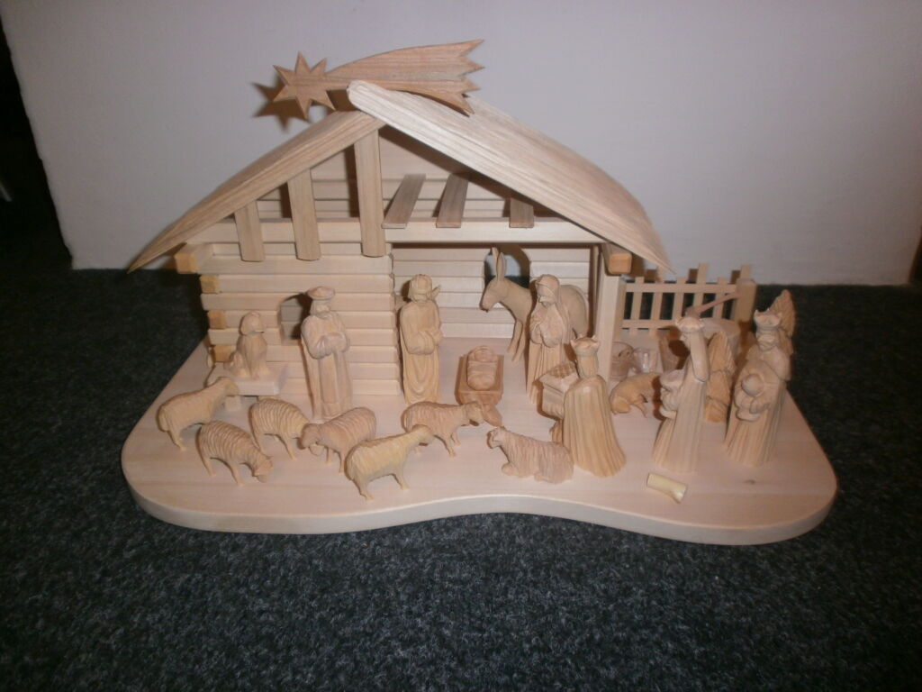 Dřevěný ručně vyřezávaný betlém,velikost domečku šířka=48cm, hloubka=25cm, výška=25cm, figurky jsou vysoké cca 10cm, vyřezané z lipového dřeva, bez povrchové úpravy. Domek je z lipového dřeva.