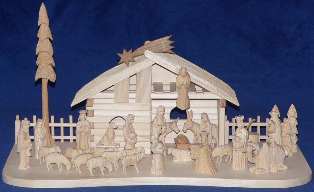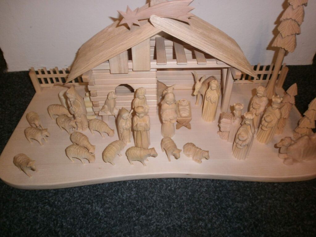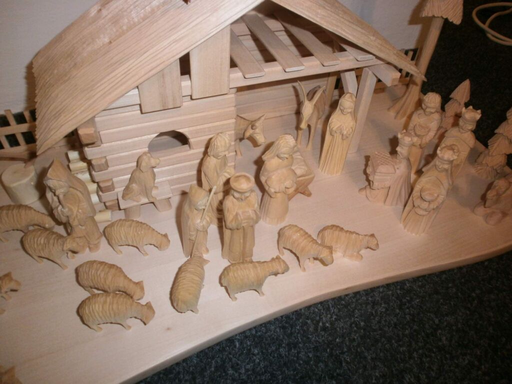 Dřevěný ručně vyřezávaný betlém,velikost domečku šířka=63cm, hloubka=30cm, výška=25cm, figurky jsou vysoké cca 10 cm, vyřezané z lipového dřeva, bez povrchové úpravy. Domek je z lipového dřeva.