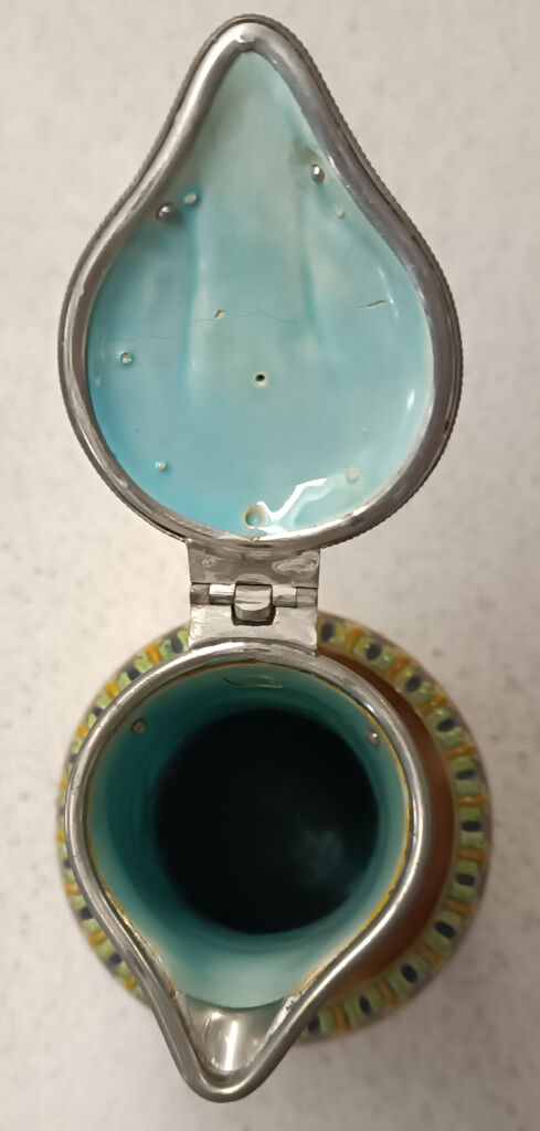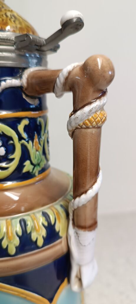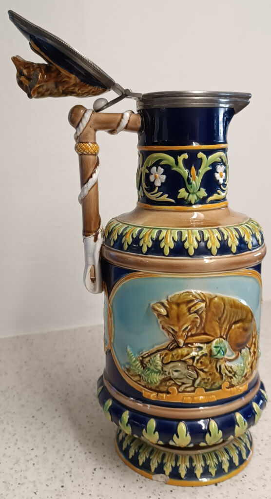 Prodám keramický džbán s víkem, s liškou a psem od Goerge Jonese. Na obou stranách obrazové reliéfy, jeden zobrazuje retrívra honícího křepelku a druhý lišku čekající, až se vrhne na králíka. Zbarvení: převládá tyrkysová, modrá, zelená, viktoriánský styl, majolika. Výroba: Anglie okolo roku 1870. Výška 29,8 cm, šířka 12,4 cm, hloubka 12,4 cm. Ucho džbánu poškozené. Osobní převzetí v Praze.