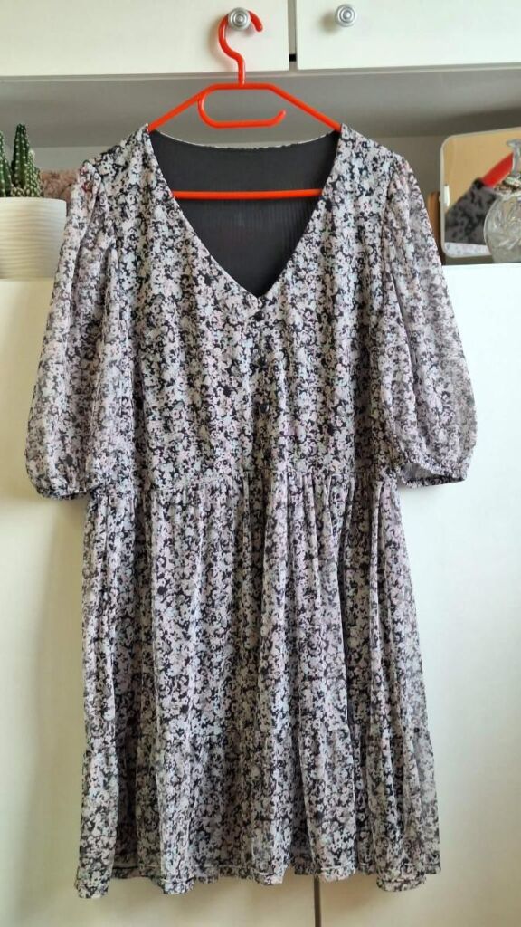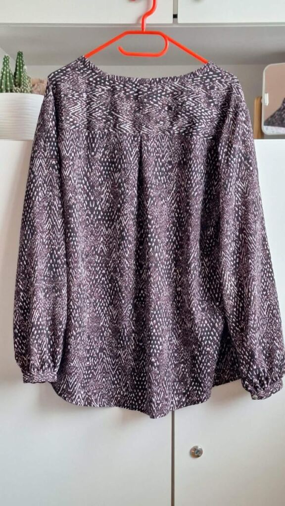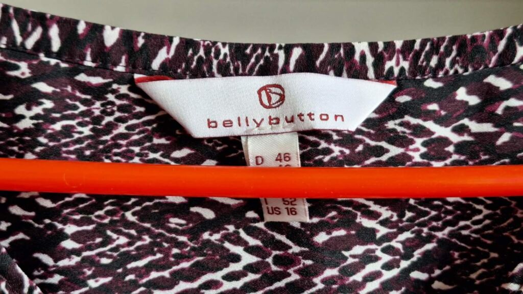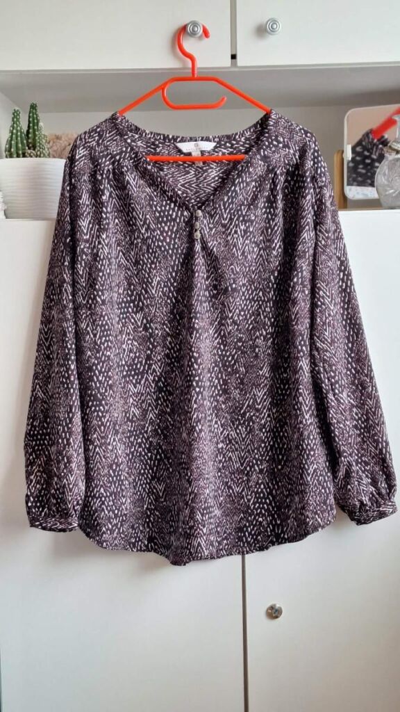 BELLY BUTTON pěkná halenka. V kombinaci barev fialová-bílá-černá. Velikost 46, s délkou 70 cm, šířka přes prsa 60 cm. Mírně áčkový střih, rozšiřuje se dolů – šířka u spodního okraje 80 cm. Lehký příjemný materiál – polyester bez elastanu, neobepíná. Halenka je neprůhledná. Rukávy dlouhé s légou a knoflíčkem. Zapínání vpředu ve výstřihu na knoflíčky ( ale nemusí se rozepínat ). Halenka je volná a vzdušná. Jako nová, bezvadná. Mohu poslat Balíkovnou, Zásilkovnou.