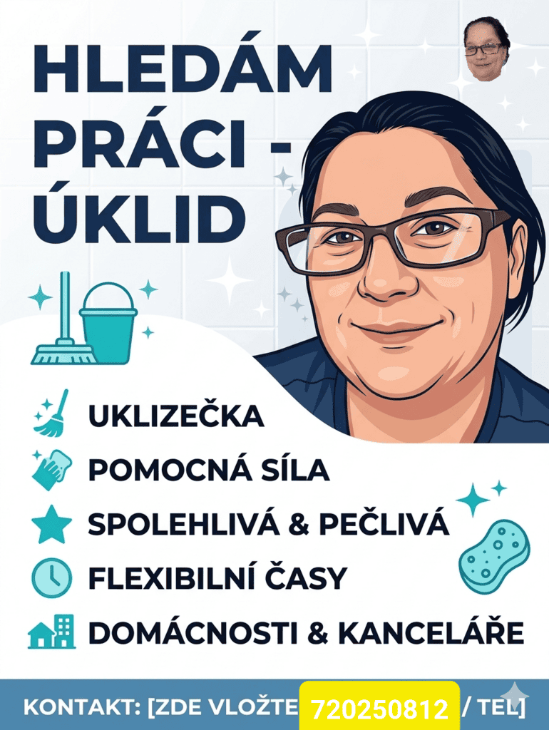 Hledám práci jako uklízečka nebo pomocná síla. Jsem žena v nejlepším věku (48 let), jsem pracovitá, dochvilná a zakládám si na precizně odvedené práci mám zkušenosti s udržováním čistoty i s běžnými domácími prácemi. Ráda pomohu s úklidem v kanceláři, bytových prostor nebo i s výpomocí v provozu.