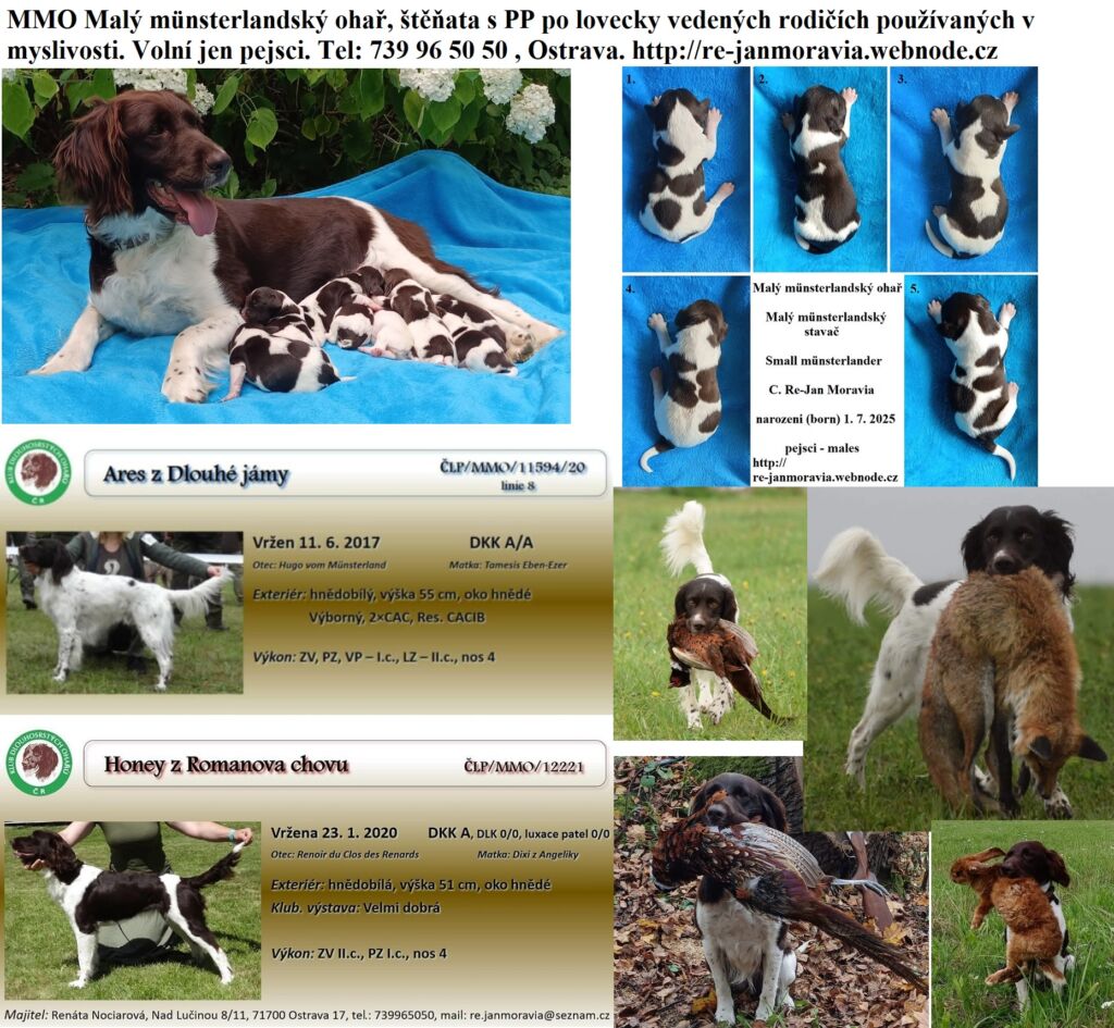 Prodám štěňata MMO – malého münsterlandského ohaře s PP, mikročipem EU petpassportem, KS, očkované, socializované k odběru ke konci srpna 2025. K zadání pouze pejsci. Vrh C. Re-Jan Moravia po lovecky vedených, zdravotně vyšetřených rodičích. Skvělí parťáci do rodin, na výlety, veselí oddaní, učenlivý psi milující děti a svou rodinu. Všestranně využitelní lovečtí psi jak na souši tak ve vodě. Oba rodiče aktivně používaní v myslivosti, mají zkoušky lovecké upotřebitelnosti – používání v lovecké praxi, na honech, i při individuálním lovu, dosledech, dohledávkách, vlohoví psi mají radost z práce, vynikající vodaři, skvělí nenároční, náruživí pracanti, nepostradatelní pomocníci v myslivosti a při lovu. Vynikající poslušnost, pevné vystavování a dobrá ovladatelnost, na honech chodí bez vodítka. Využívání v myslivosti není podmínkou. K rodině, jsou přátelští, milují děti i svou rodinu i dům zodpovědně pohlídají. Nenároční psi střední velikosti, aktivní, veselí parťáci.