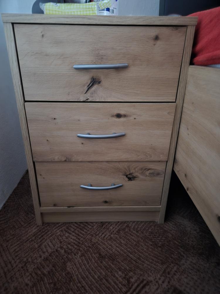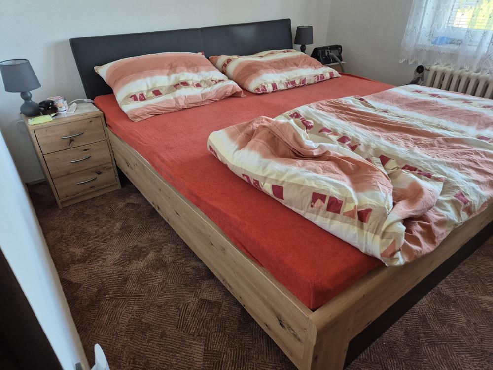 dřevěná- dub artisan + grafit, zadní čelo potažené textilní kůží, rošty + matrace + 2 noční stolky