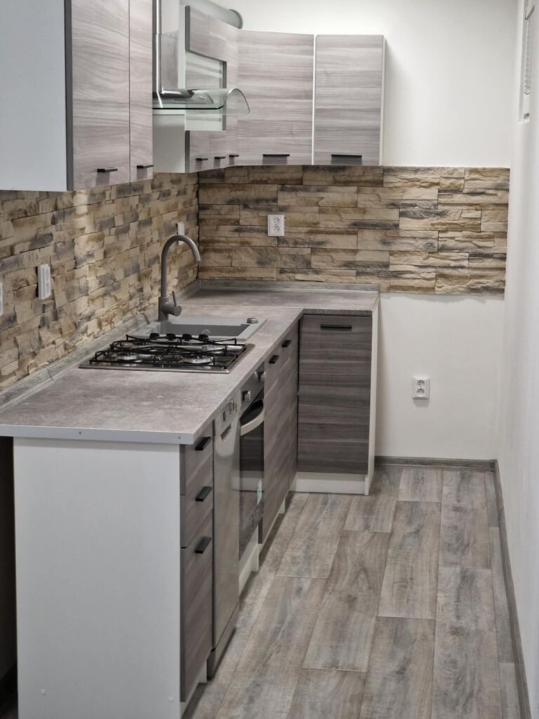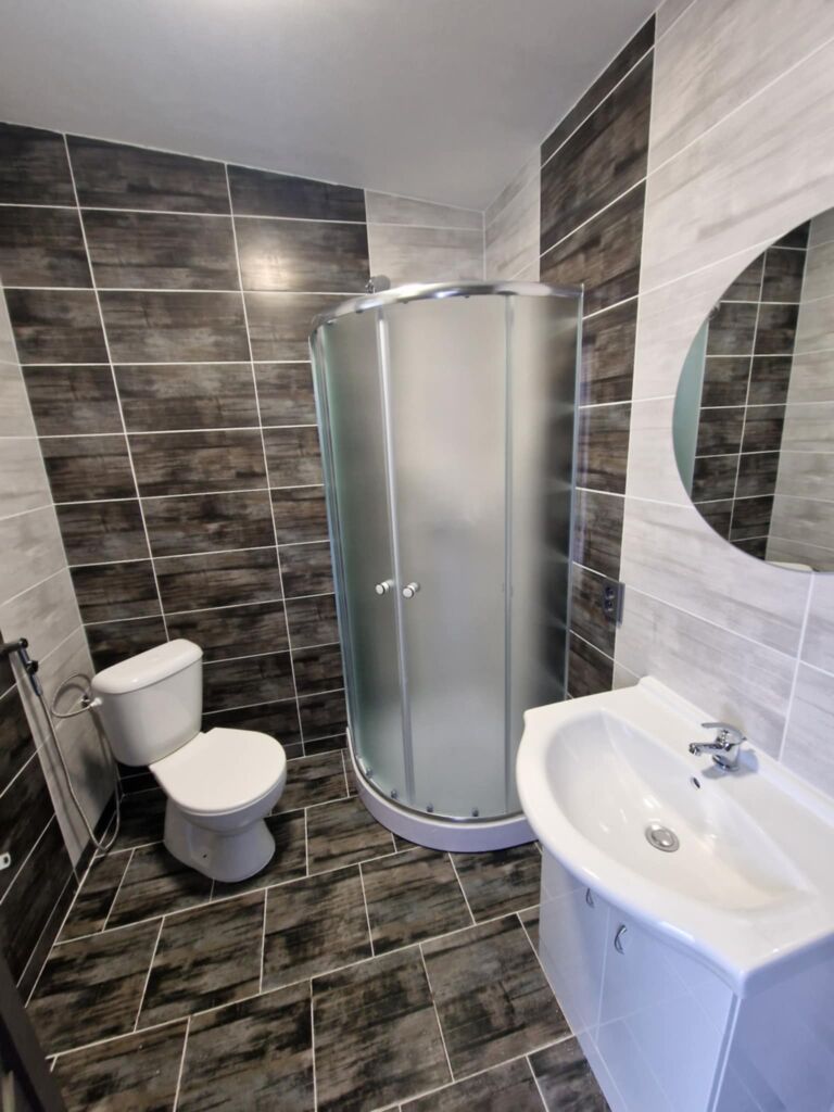 V koupelně je keramický obklad až do stropu, sprchový kout se sprchovým setem,umyvadlo se skříňkou, zrcadlo, bojler, WC, bidetová sprška, připojení na pračku.