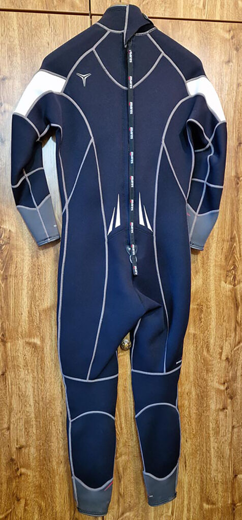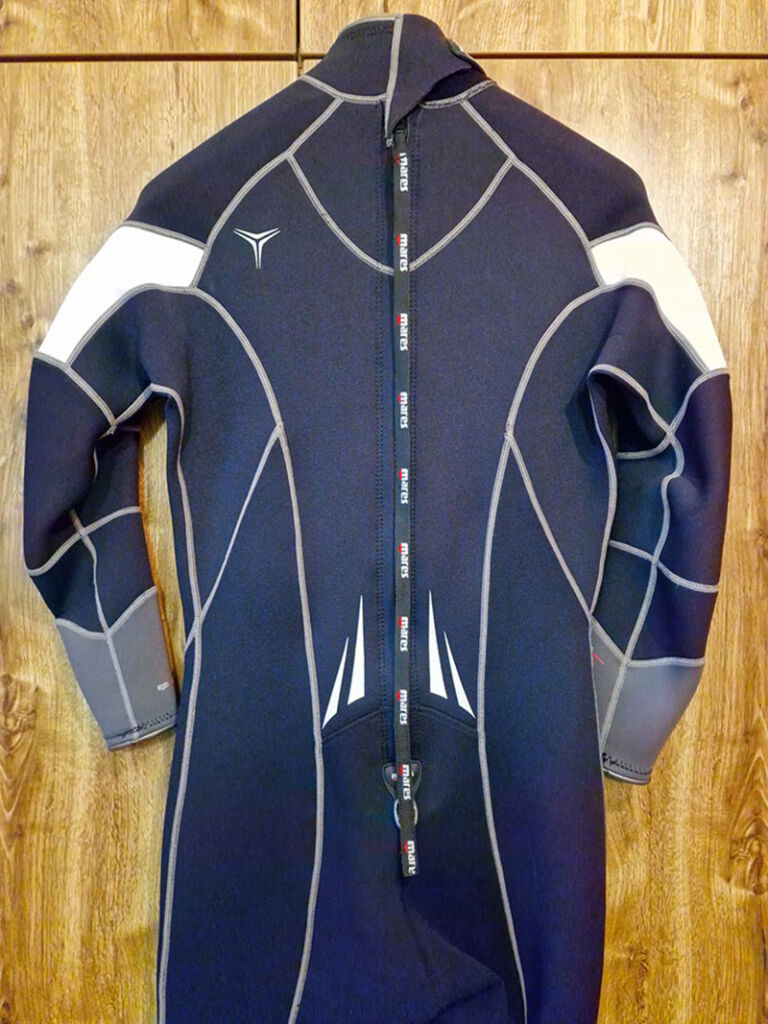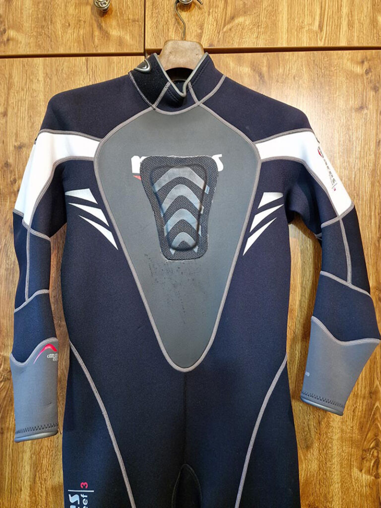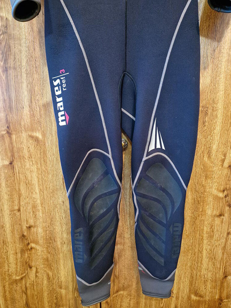 Neopren Mares Reef 3 ve velikosti 5 s dodatečně nalepeným ochranným štítem hrudníku pro spearfishing.