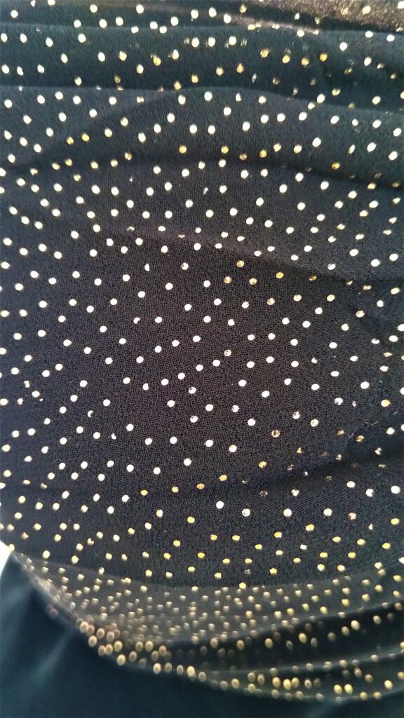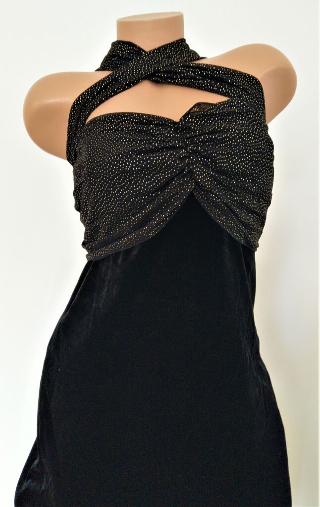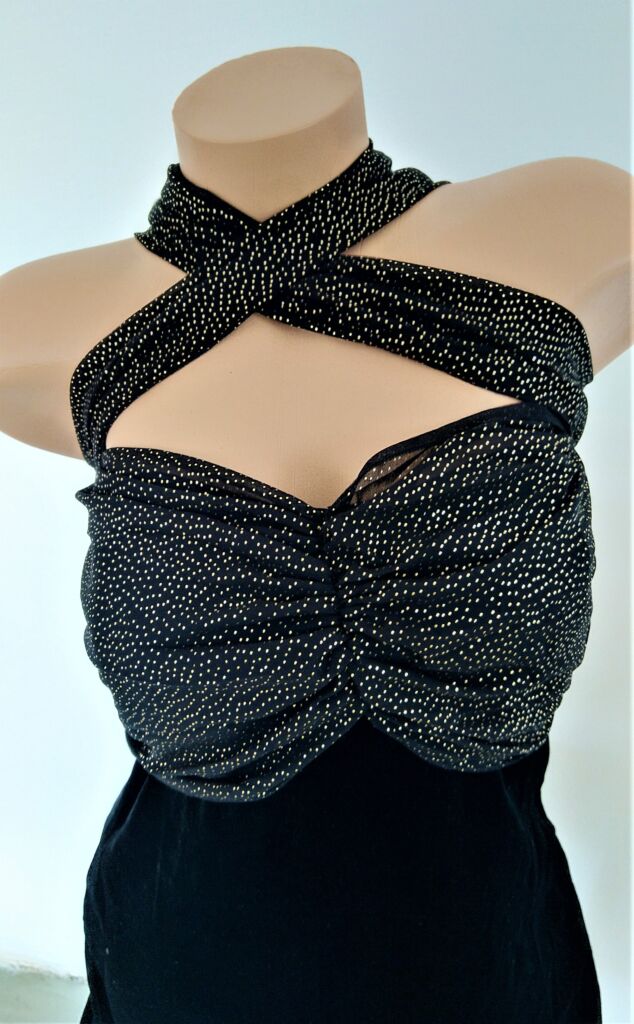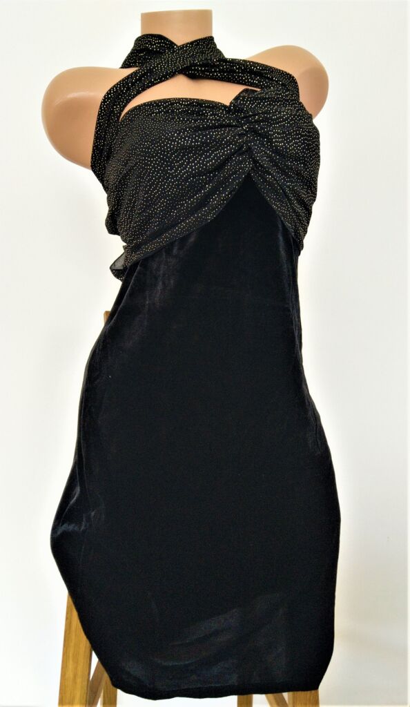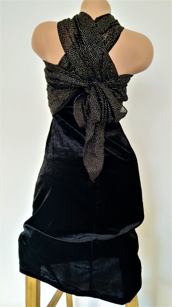 Sametové šaty. 5 v 1. Díky návodu na různé způsoby zavazování šatů, získáte 5 šatů v jednom. Na šále na zavazování zlaté puntíčky/třpytky.