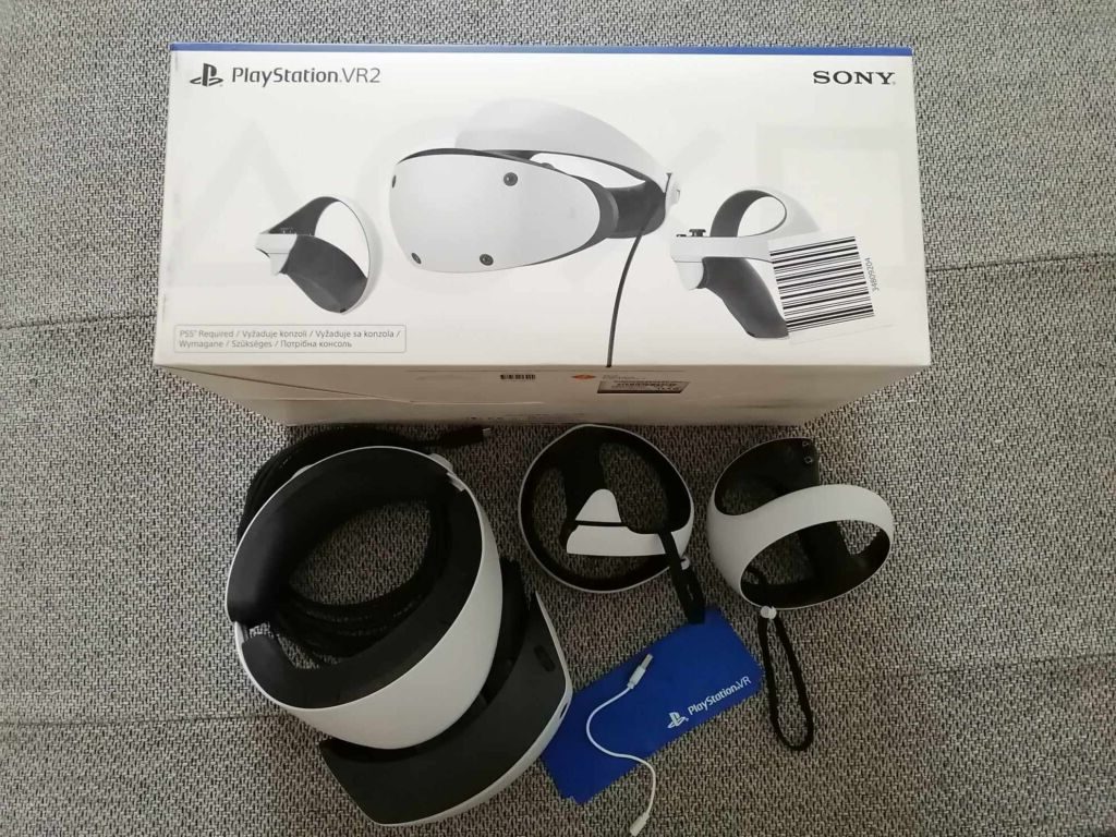 Obsahuje: Souprava VR, Ovladač PlayStation VR2Sense (L)/(R)s připevněnými řemínky, Kabel USB (k párování a nabíjení ovladače), Stereofonní sluchátka, 6 špuntů, Tištěné materiály.