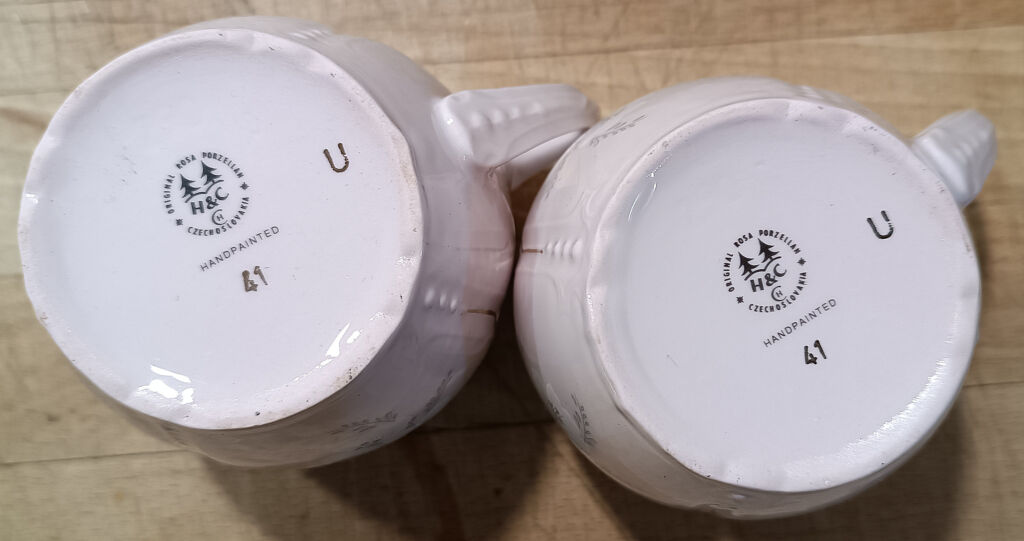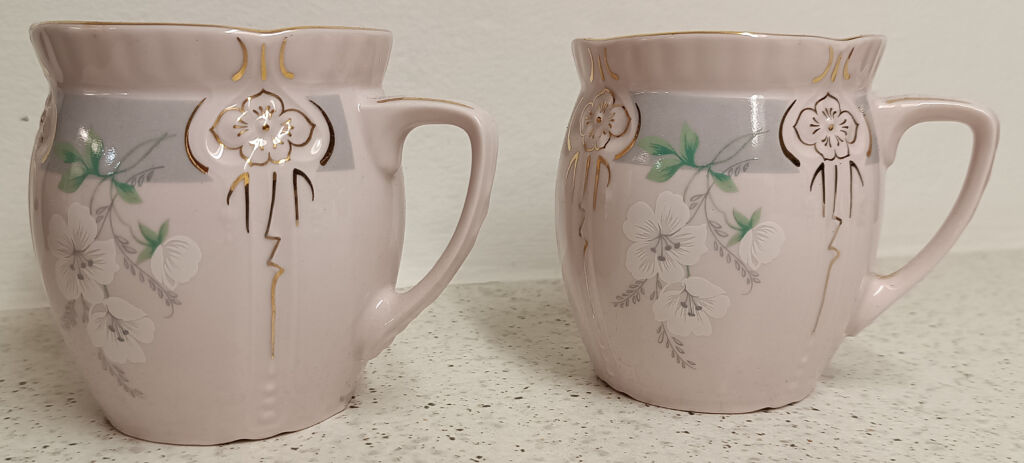 Porcelánový hrnek růžové barvy s jemnými zlatými a květinovými motivy, vitrifikovaná keramika. Porcelánka Hass a Czjzek. Objem 300 ml. Perfektní stav. 2 kusy. Nepoužívané