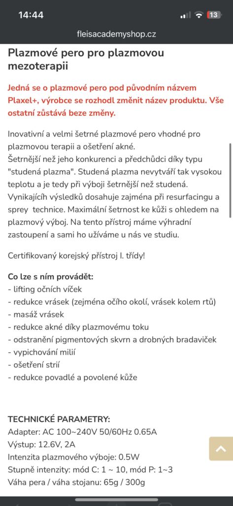 Nabízím prémiové plazmové pero zakoupené přímo ve Fleiš Academy v Mostě. Jde o technologii pravé studené plazmy, která je k pleti mnohem šetrnější a výrazně zkracuje dobu hojení.