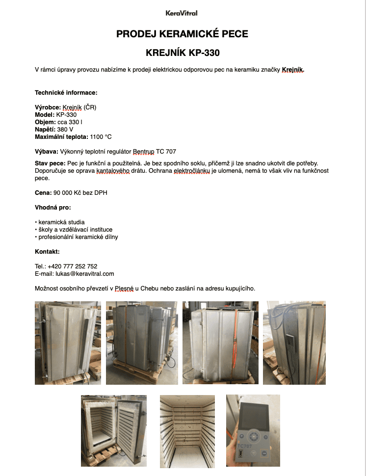 V rámci úpravy provozu nabízíme k prodeji elektrickou odporovou pec na keramiku značky Krejník.