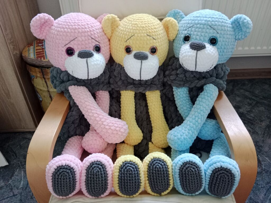 Háčkovaní pyžamožrouti z žinylkové – plyšové vlny, která je speciálně vyvinutá pro kojence na deky, muchláčky a polštářky. Na délku mají 55cm, hlavička a tlapky jsou vycpané dutým vláknem, které se dává běžně do polštářů, dají se prát na 30.