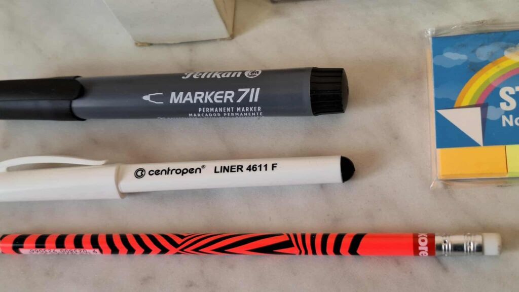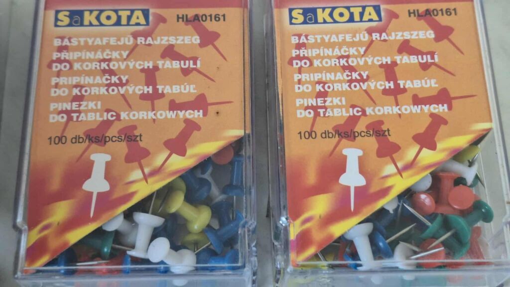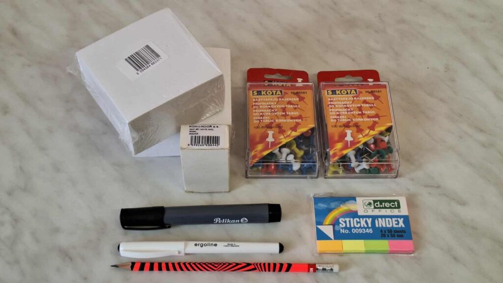 SADA POTŘEB DO ŠKOLY, KANCELÁŘE obsahuje : 2 x trhací bloček 9 x 9 x 5 cm + 2 x 100 ks balení barevných špendlíků Sakota pro korkové tabule + 1 x 500 ks krabička klasických špendlíků + 1 x černý fix permanent marker black Pelikan + 1 x tenký černý fix liner Centropen + 1 x tužka Kores s gumou + 1 x barevné lepící záložky 4 x 50 ks. CENA CELKEM ZA CELOU SADU 50,- Kč. Mohu poslat Balíkovnou, Zásilkovnou.