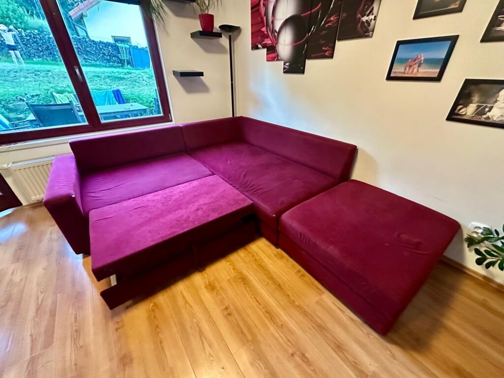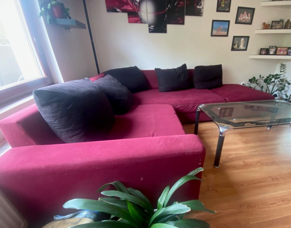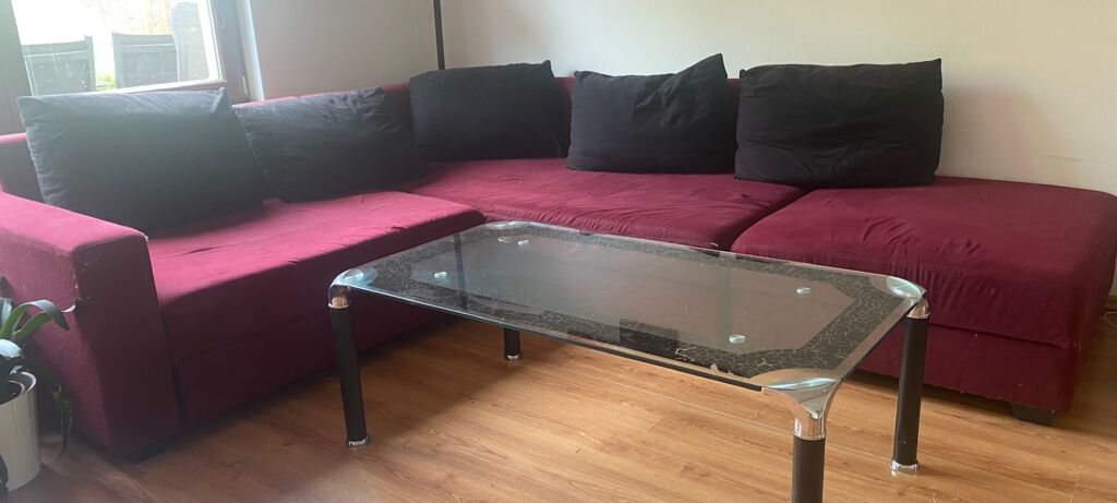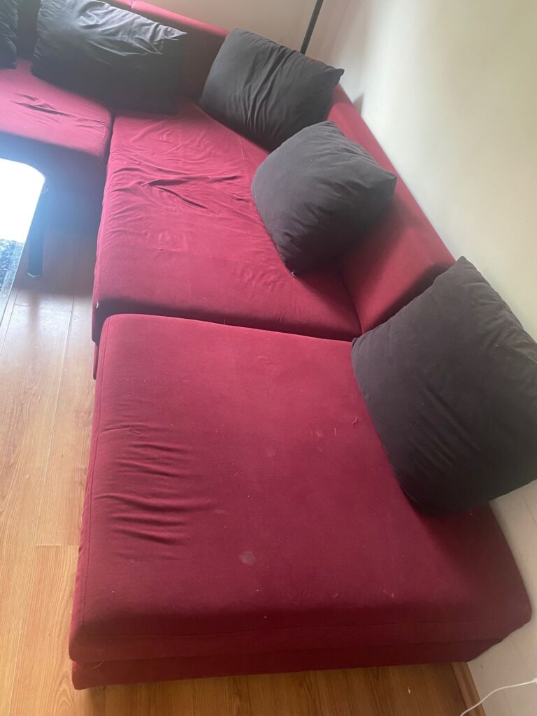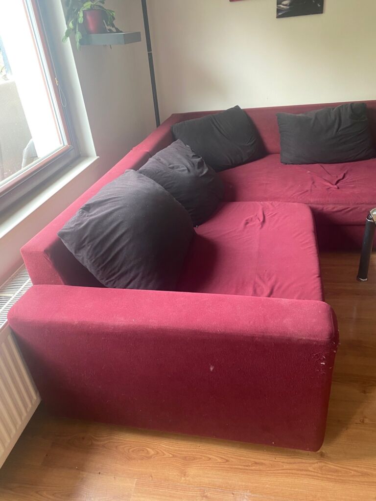ZA ODVOZ, sedací souprava (po třech dětech, po třech kočičkách:)! – s možností udělat spací plochu, 4x velký polštář k tomu – rozměry délka u okna cca 220cm, délka u stěny cca 270cm (včetně taburetu 85cm), šířka sedící plochy cca 95cm