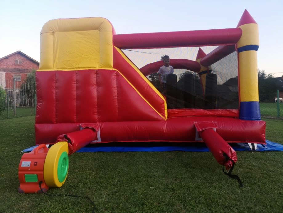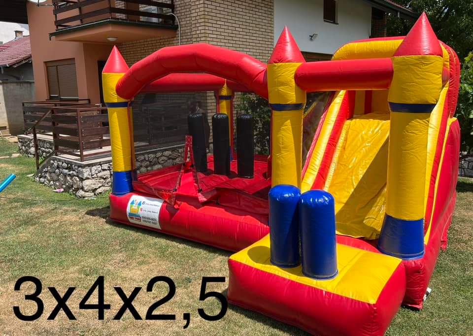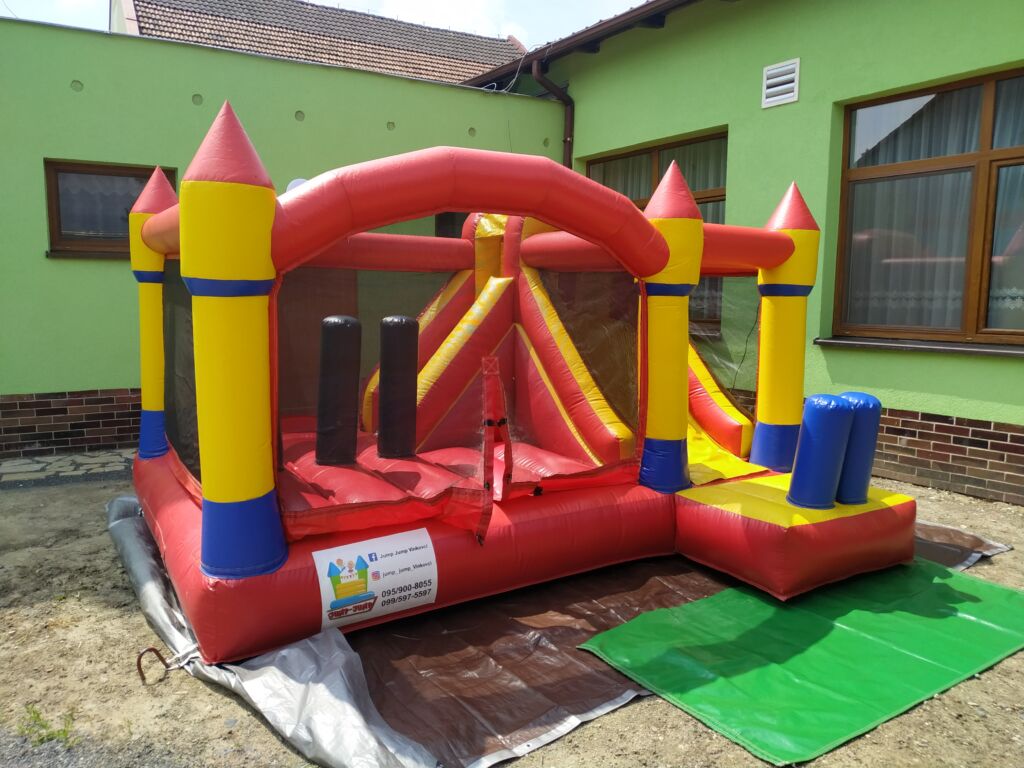 Velikost skákacího hradu je 3 x 4 metrů (výška 2,5 metru). Kvalitní skákací hrad, žádná nafukovací atrakce, která nedrží ani tvar (Happy hop apod.). Skákací hrad je určen pro 4-5 dětí naráz ve věku 3-6 let. Součástí zapůjčení je fukar o výkonu 1,1 KWh a plachta pod skákací hrad. Zdarma můžeme zapůjčit také prodlužovací kabel 50m.