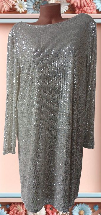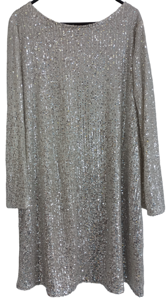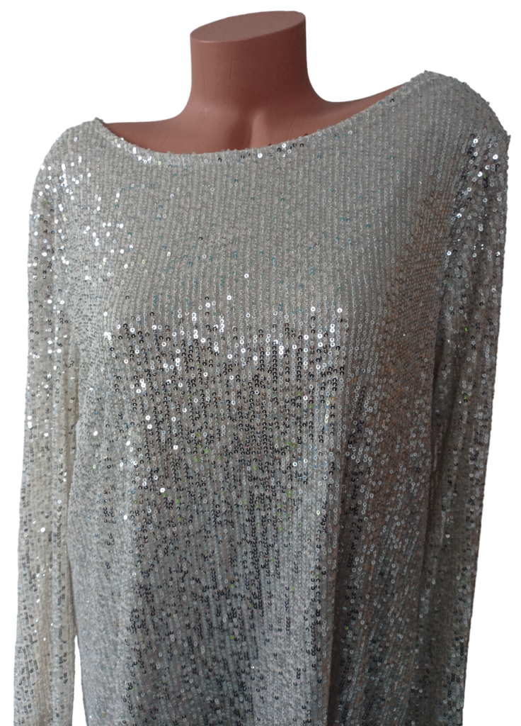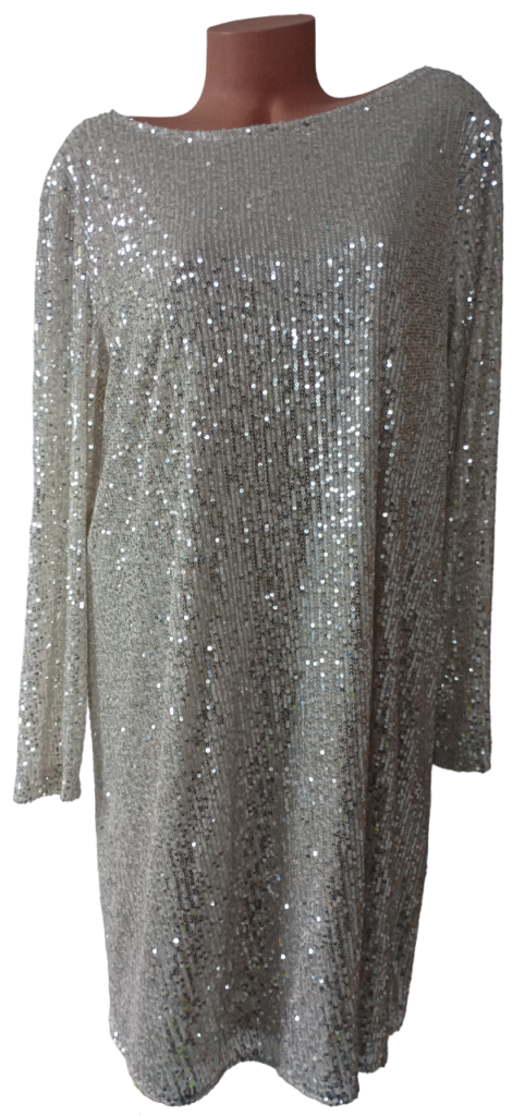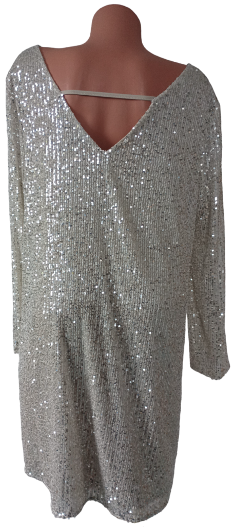 Šaty s flitry (stříbrné flitry na světle béžové látce). Perfektní stav. Značka Blind Date. Velikost 42/XL, ale jsou o dost větší, řiďte se mírami. 🙂 Rozměry: délka 95 cm, průramky 2 x 53 – 66 cm, pas 2 x 60 – 82 cm, boky 2 x 65 – 97 cm, spodní lem 2 x 71 až 103 cm, rukáv od krku 67 cm. Materiál neuveden, pravděpodobně polyester + elastan. Cena 279,- Kč.