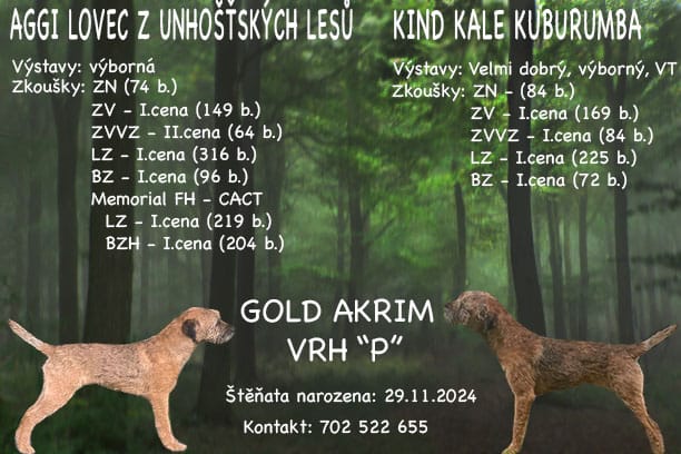 Border teriér štěňata s PP. Štěňata Border teriéra s PP po výborných rodičích. O: Kind Kale Kuburumba, Výborný, ZN. 84 b, ZV I.c hlasitost 3, ZVVZ I.c, LZ I.c, BZ I.c. M: Aggi z Unhošťskych lesů , Výborná, ZN 84 b, ZV I.c, ZVVZ II.c , BZ I.c, LZ I.c , BZH I.c , Memoriál Františeka Hebedy CACT. Předpoklad kvalitní práce i exteriér. Štěňata vhodná pro práci i jako společník do rodiny i dětem.