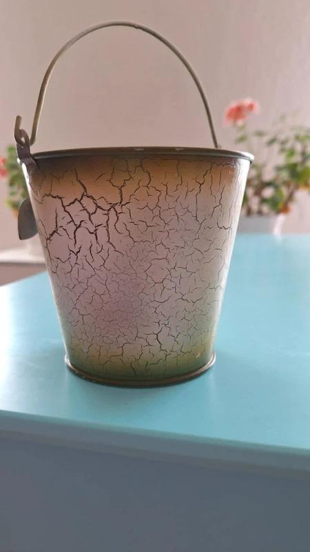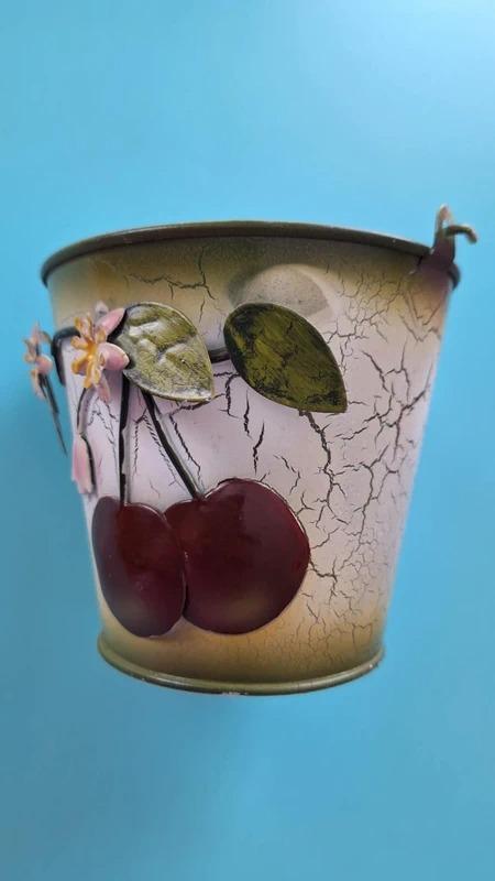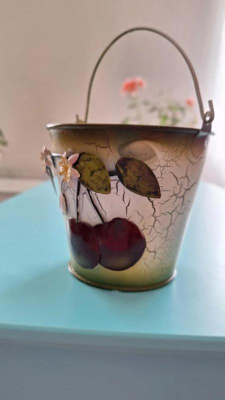 VINTAGE KVĚTINÁČ – KBELÍK s kvítky a třešinkami. Rozměr 12,5 x 8,5 cm. Květináč je kovový, s krakelovaným designem. Pěkný, v bezvadném stavu. Mohu poslat Balíkovnou, Zásilkovnou.