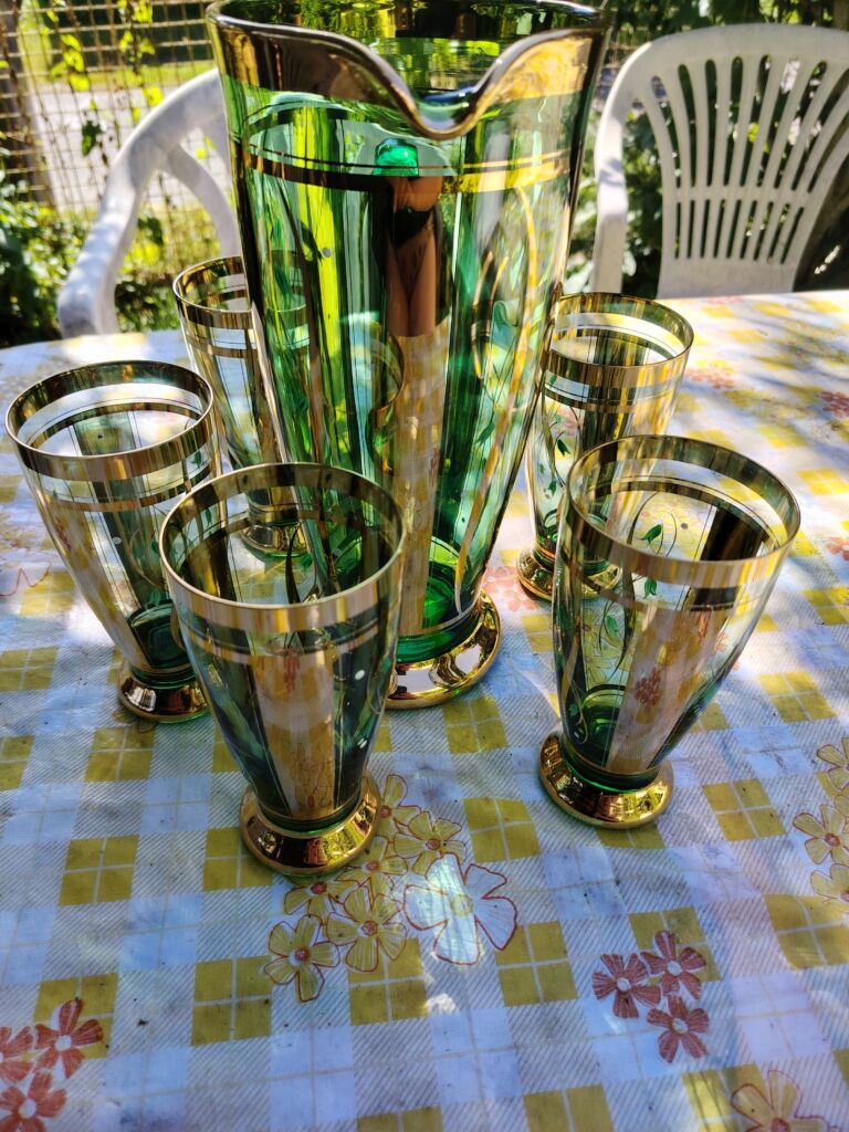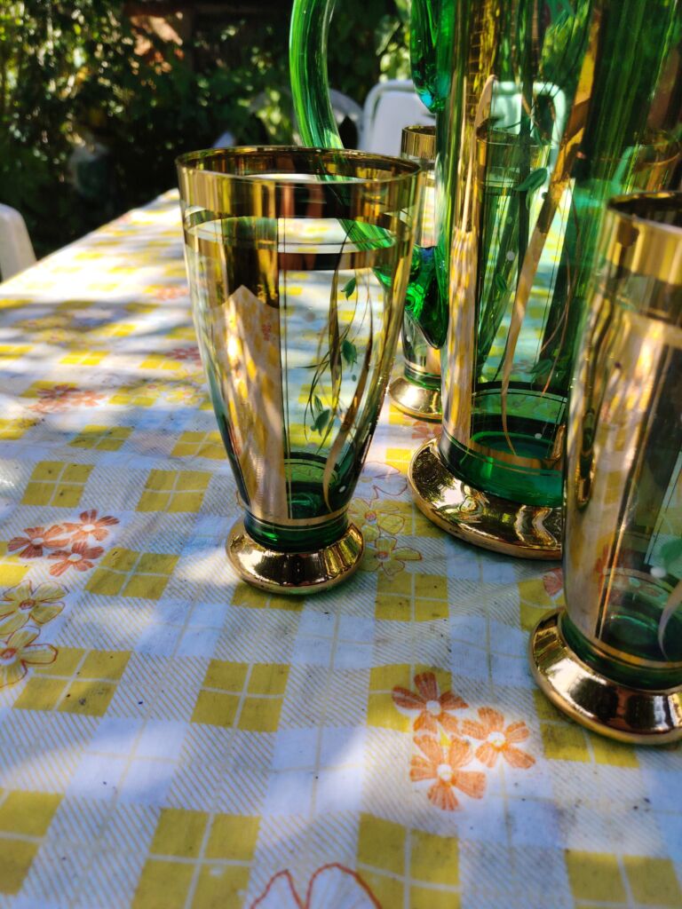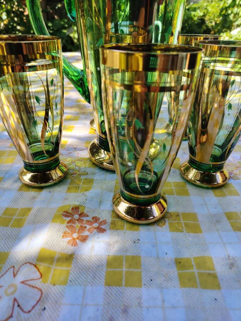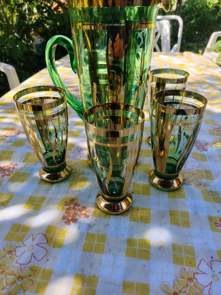 Prodám zelený skleněný džbán a 5 skleniček. Vystavený ve vytríně. Rozměry: Džbán: Výška 27cm, hrdlo 12cm. Skleničky: Výška 15cm, hrdlo 7cm. Po Děčíně možno dovést. Možno poslat dobírkou + dobírka. Psát, volat na mobil 731202712.